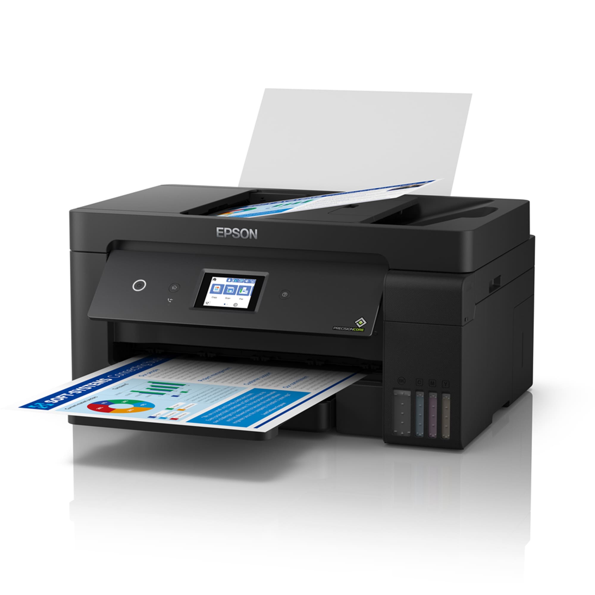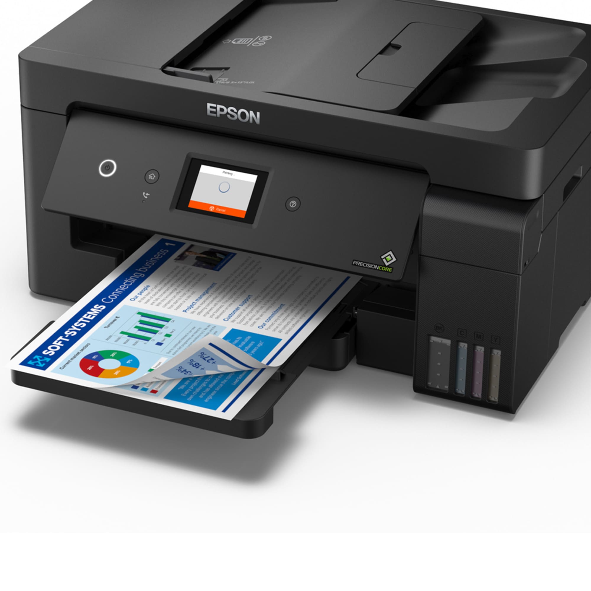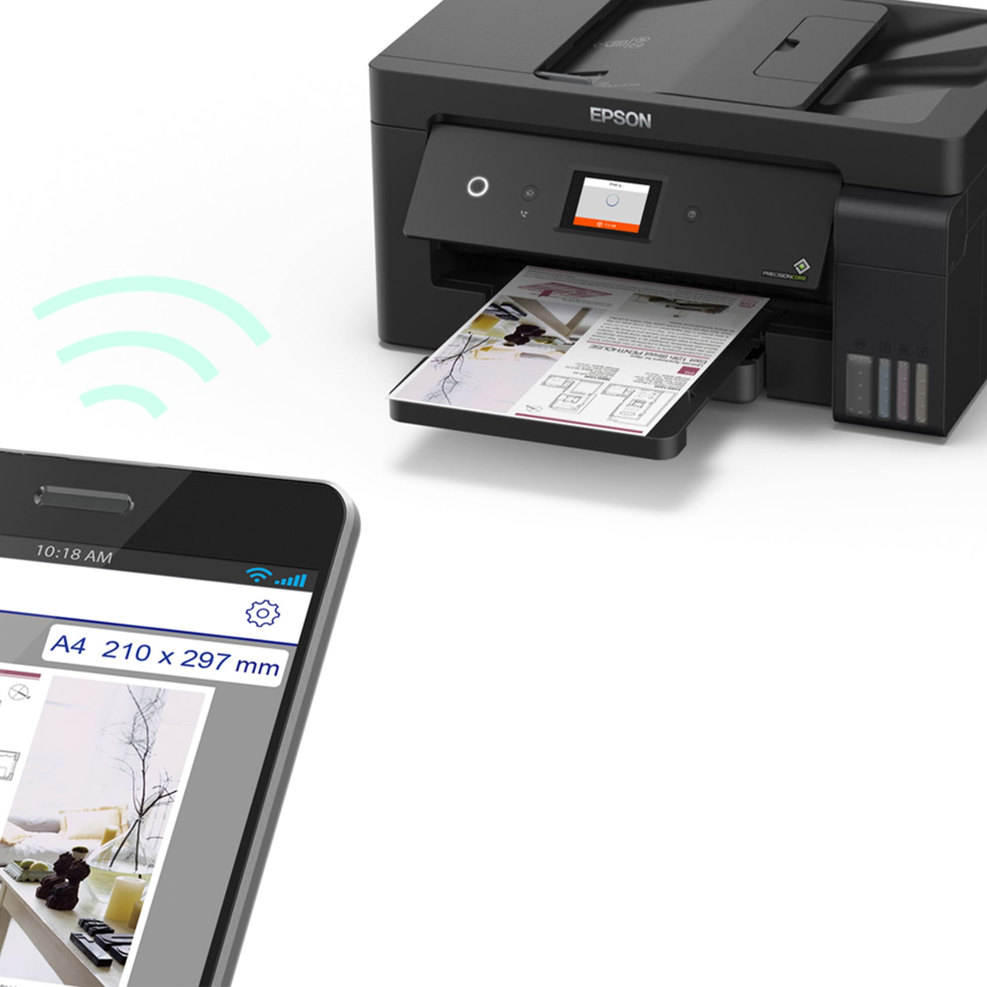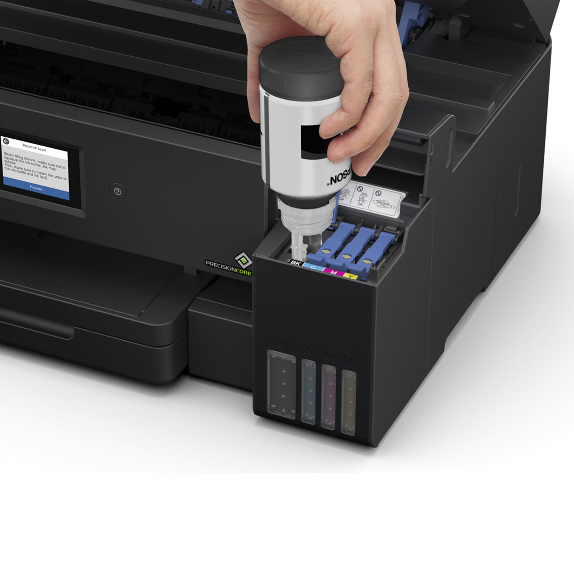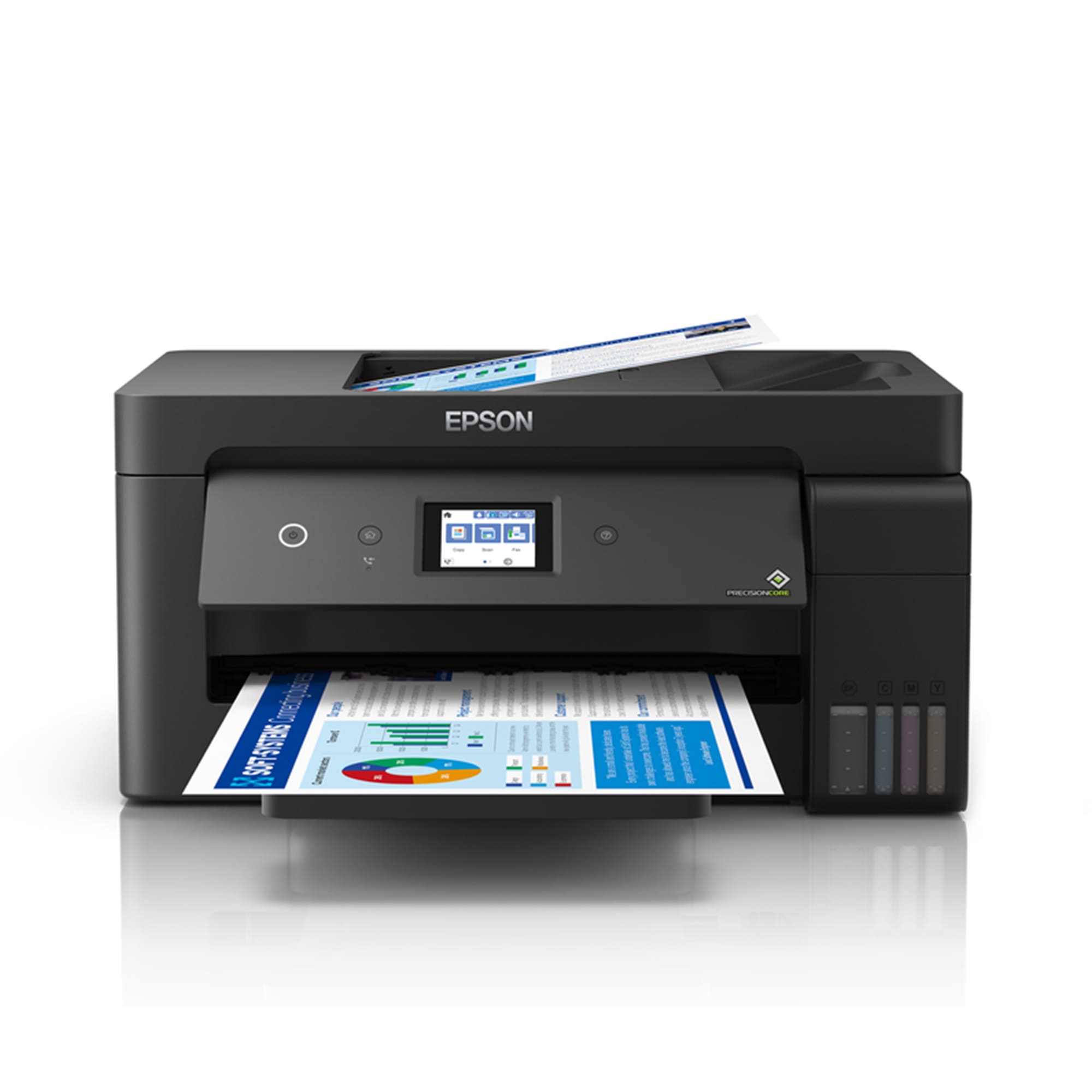 La nueva multifuncional inalámbrica EcoTank 4 en 1 L14150 te ofrece impresión 100% sin cartuchos con soporte para formatos anchos hasta A3+, con botellas de tinta diseñadas para evitar derrames y codificadas para llenado fácil de cada color.